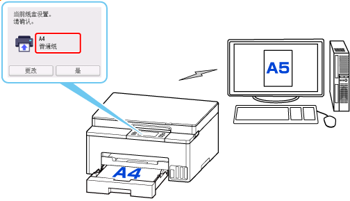 例如,如果用于打印/复印的纸张尺寸设置为A5,而打印机上注册的纸张信息为A4,则在开始打印/复印前,请先在纸盒中装入A5尺寸的纸张。