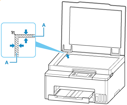 เครื่องพิมพ์ไม่สามารถสแกนพื้นที่ที่มีแถบ (A) (1 mm (0.04 in) จากขอบของกระจกแท่นวาง)
