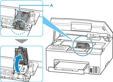 Parçayı (A) tutarak yazıcı kafası kilitleme kapağını açın ve İleri (Next) seçeneğini belirleyin.