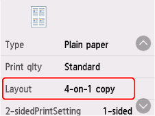 Chọn Cài đặt(Settings) trong màn hình chờ sao chép để hiển thị màn hình cài đặt in. Chọn Sao 4 trên 1(4-on-1 copy) trong Bố cục(Layout) và chọn OK.