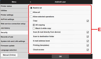 Администрирането на потребители може да се зададе и от операционния панел на принтера.