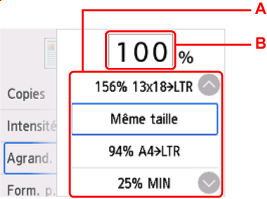 Vous pouvez éventuellement spécifier le niveau d'agrandissement ou sélectionner une copie en fonction d'un pourcentage prédéfini ou de l'échelle du papier.