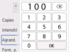 L'écran ci-dessous s'affiche lorsque vous sélectionnez Paramètres sur l'écran d'attente de copie, puis Agrand. pour sélectionner la méthode de réduction ou d'agrandissement. Spécifiez l'agrandissement et sélectionnez OK.
