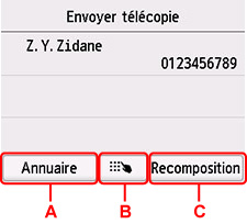 B: S'affiche si vous avez spécifié un premier destinataire parmi les destinataires enregistrés. Ajoute le destinataire en entrant les numéros de télécopie/téléphone.