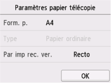 • Si le format du papier chargé est différent de celui indiqué par le paramètre de format papier, les fax reçus sont stockés dans la mémoire de l'imprimante et le message, Vérifiez le format de page et touchez [OK]. s'affiche sur l'écran tactile.