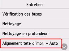 Pour imprimer et vérifier les valeurs de réglage actuelles de la position de la tête d'impression, sélectionnez Impr. valeur d'align. des têtes sur l'écran Entretien.