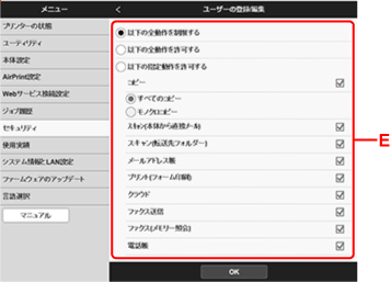 ユーザーを管理する設定は、プリンターの操作パネルからもできます。