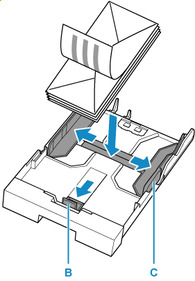 Glisaţi ghidajele pentru hârtie (B) spre partea frontală şi (C) spre dreapta pentru a deschide ghidajele.