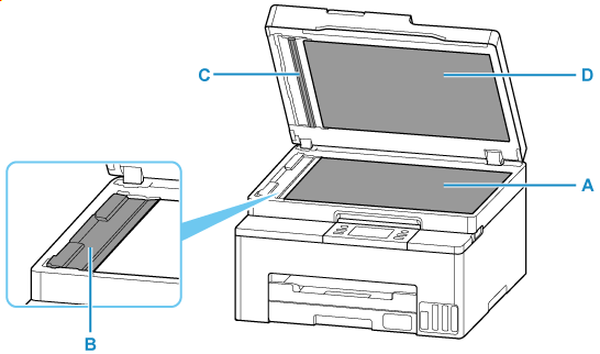 Ștergeți petele sau praful de pe suprafețele de sticlă ale geamului plat (A şi B), precum şi de pe componentele care intră în contact cu aceste suprafeţe (C şi D).