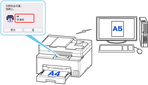 例如,如果用于打印/复印的纸张尺寸设置为A5,而打印机上注册的纸张信息为A4,则在开始打印/复印前,请先在纸盒中装入A5尺寸的纸张。