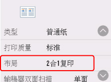在复印待机屏幕上选择设置以显示打印设置屏幕。 在布局中选择2合1复印,然后选择OK。