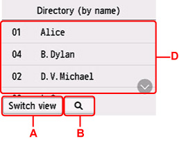 B: Chọn để hiển thị màn hình chọn chữ đầu. Bạn có thể tìm kiếm người nhận đã đăng ký bằng chữ đầu.