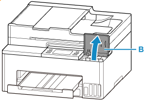 Mở nắp bình mực (B).