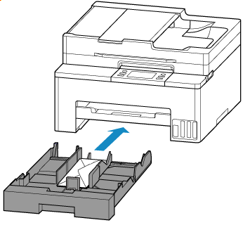 قم بتحميل الأظرف بالاتجاه الطولي مع إعادة توجيه وجه الطباعة لأسفل، ثم ضعها في منتصف الدرج.