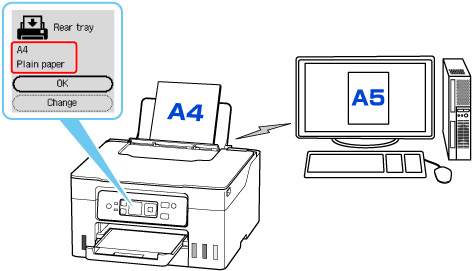 Näiteks kui printimise/kopeerimise paberisuruuse määrang on A5 ja printeri jaoks registreeritud paberiteave on A4, laadige enne printimise/kopeerimise alustamist tagumisele alusele või kassetti paberit suurusega A5.