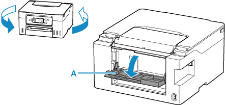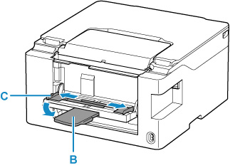 Tõmmake paberitugi välja (B) ja libistage vasakpoolset paberijuhikut (C).