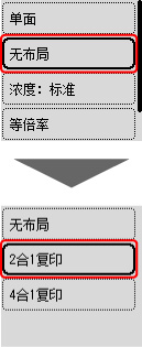 在复印待机屏幕上按OK按钮以显示打印设置屏幕,然后从布局的其他中选择2合1复印。