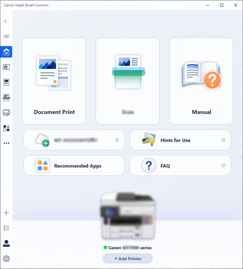 Klõpsake ekraani Canon Inkjet Smart Connect Avakuva (Home) vasakul küljel olevale