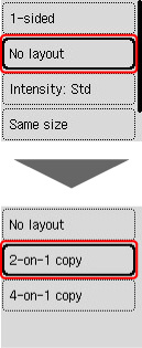Kui funktsioon 2-1 koopia (2-on-1 copy) on valitud, saate määrata originaali suuna ja järjestuse.