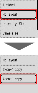 Kui funktsioon 4:1 koopia (4-on-1 copy) on valitud, saate määrata originaali suuna ja järjestuse.