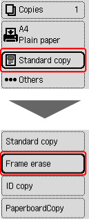 Trükkimismäärangute ekraani kuvamiseks vajutage kopeerimise ooterežiimi kuval nuppu OK ja seejärel valige suvand Raami kustut. (Frame erase).