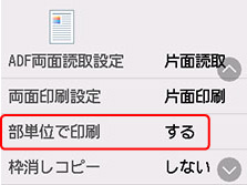 コピー待機画面で[印刷設定]を選んで印刷設定画面を表示し、[部単位で印刷]を選んで、[する]を選びます。