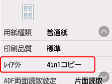 コピー待機画面で[印刷設定]を選んで印刷設定画面を表示し、[レイアウト]で[4in1コピー]を選んで、[OK]を選びます。