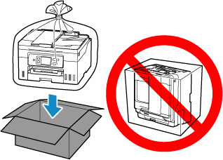 • Lūdzu, rīkojieties uzmanīgi un nodrošiniet, lai kaste būtu plakanā stāvoklī, NEVIS apgāzta otrādi vai uz sāniem, jo printeris var būt bojāts un tajā esošā tinte var izplūst.