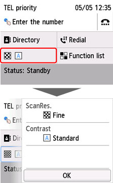 Faksa gaidstāves ekrānā varat nomainīt sūtīšanas iestatījumus, piemēram, skenēšanas kontrastu vai izšķirtspēju.