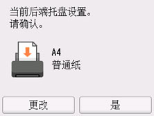 如果选择关,则不会显示确认纸张设置的屏幕。 进行打印时,请正确设置后端托盘纸张设置或纸盒纸张设置中的纸张尺寸和类型。
