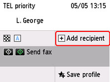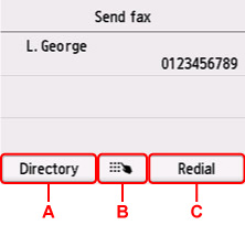 B: Prikazano, če ste določili prvega prejemnika iz registriranih prejemnikov. Doda prejemnika z vnosom številk faksa/telefonskih številk.