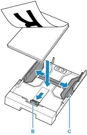 3. Virziet papīra vadotni priekšpusē (B) un pa labi (C), lai atvērtu vadotnes.