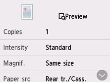 Zaslon z nastavitvami tiskanja se prikaže, ko izberete možnost Nastavitve (Settings) na zaslonu kopiranja v pripravljenosti.