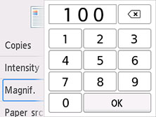 Spodnji zaslon se prikaže, ko na zaslonu kopiranja v pripravljenosti izberete Nastavitve (Settings) in nato izberete Povečava (Magnif.), da izberete način pomanjšanja/povečanja. Določite povečavo in izberite OK.
