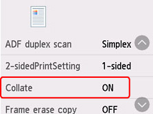 Izberite Nastavitve (Settings) na zaslonu kopiranja v pripravljenosti, da prikažete zaslon nastavitev tiskanja. Izberite Zbiranje (Collate) in izberite VKLOP (ON).