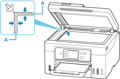 Tiskalnik ne more optično brati na območju, označenem z diagonalnimi črtami, (A) (1 mm (0,04 palca) od robov steklene plošče).