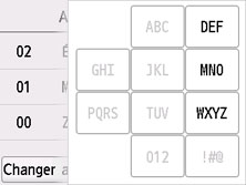 B: Sélectionnez pour afficher l'écran de sélection d'une initiale. Vous pouvez rechercher le destinataire enregistré d'après son initiale.