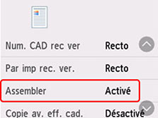 Sélectionnez Paramètres dans l'écran d'attente de copie pour afficher l'écran des paramètres d'impression. Sélectionnez Assembler et Activé.