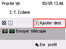 B: S'affiche si vous avez spécifié un premier destinataire parmi les destinataires enregistrés. Ajoute le destinataire en entrant les numéros de télécopie/téléphone.