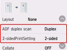 Izberite Nastavitve (Settings) na zaslonu kopiranja v pripravljenosti, da prikažete zaslon nastavitev tiskanja. Izberite Nast. 2-str. tisk. (2-sidedPrintSetting) v možnosti 2-stran. (2-sided) in izberite OK.