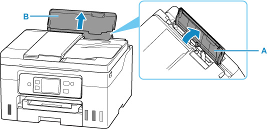 Odprite pokrov zadnjega pladnja (A) in nato oporo za papir (B) potegnite navzgor.