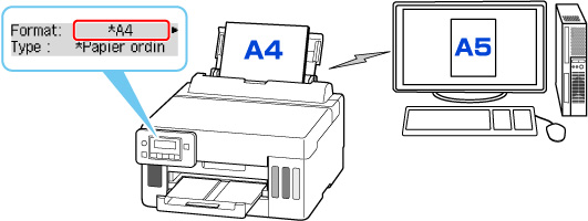 Par exemple, si le paramètre de format de papier pour l'impression est A5 et que le format de papier enregistré dans l'imprimante est A4, l'imprimante démarre l'impression sur le papier chargé dans le réceptacle arrière ou dans la cassette sans modifier le paramètre de format du papier pour l'impression.