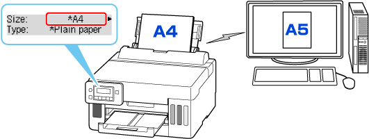 Наприклад, якщо для друку вибрано формат паперу A5, а в принтері зареєстровано формат паперу A4, принтер починає друкувати на папері, завантаженому в задній лоток або касету , не змінюючи параметр формату паперу для друку.