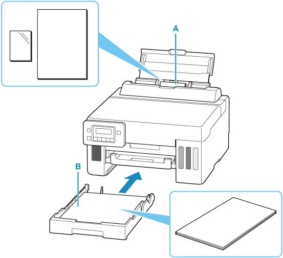 У принтері передбачено два джерела для подавання паперу: задній лоток (A) і касета (B).