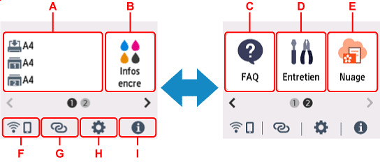 Affiche des guides rapides sur des procédures telles que le chargement du papier et le dépannage, ainsi que des informations telles que le niveau d'encre estimé et des informations système.