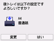 [しない]を選んだ場合は、用紙の設定を確認する画面が表示されなくなります。印刷する際は、[後トレイの用紙設定]または[カセットの用紙設定]で用紙のサイズと種類を正しく設定してください。