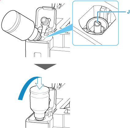 Aliniind vârful sticlei de cerneală cu orificiul de umplere (J) al rezervorului de cerneală, răsturnaţi încet sticla şi împingeţi-o în orificiul de umplere.
