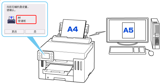 例如,如果用于打印的纸张尺寸设置为A5,而打印机上注册的纸张信息为A4,则先在后端托盘或纸盒中装入A5尺寸的纸张,然后再开始打印。