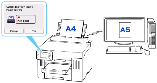 Ví dụ, khi cài đặt cỡ giấy để in là A5 nhưng thông tin giấy đã đăng ký với máy in là A4, bạn nạp giấy cỡ A5 vào khay sau hoặc cát-xét trước khi bắt đầu in.