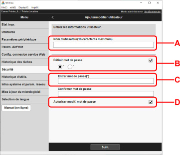 L'administrateur peut enregistrer l'utilisateur via l'interface utilisateur distante. L'administrateur informe l'utilisateur du nom d'utilisateur et du mot de passe (lors de la définition du mot de passe). L'utilisateur enregistré doit faire attention à ne pas oublier le nom d'utilisateur et le mot de passe.